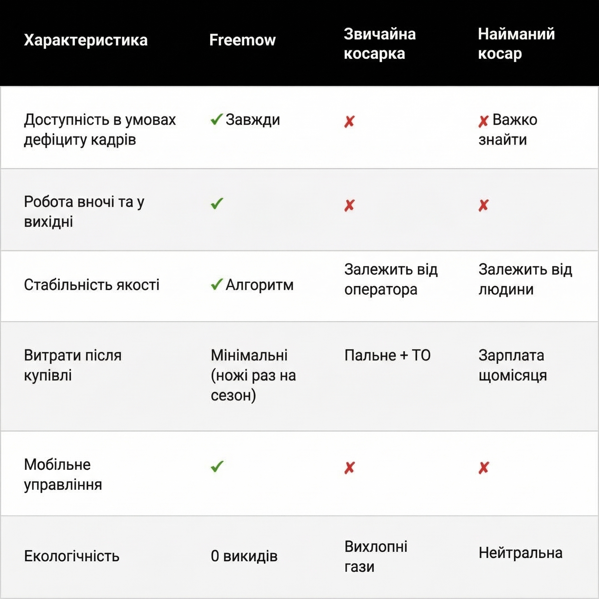Середній косар в Україні: 15 000–25 000 грн/міс. Freemow Serie M+ RBA901 (≈ 40 000 грн) окупиться за одне літо — і далі працює без додаткових витрат.
